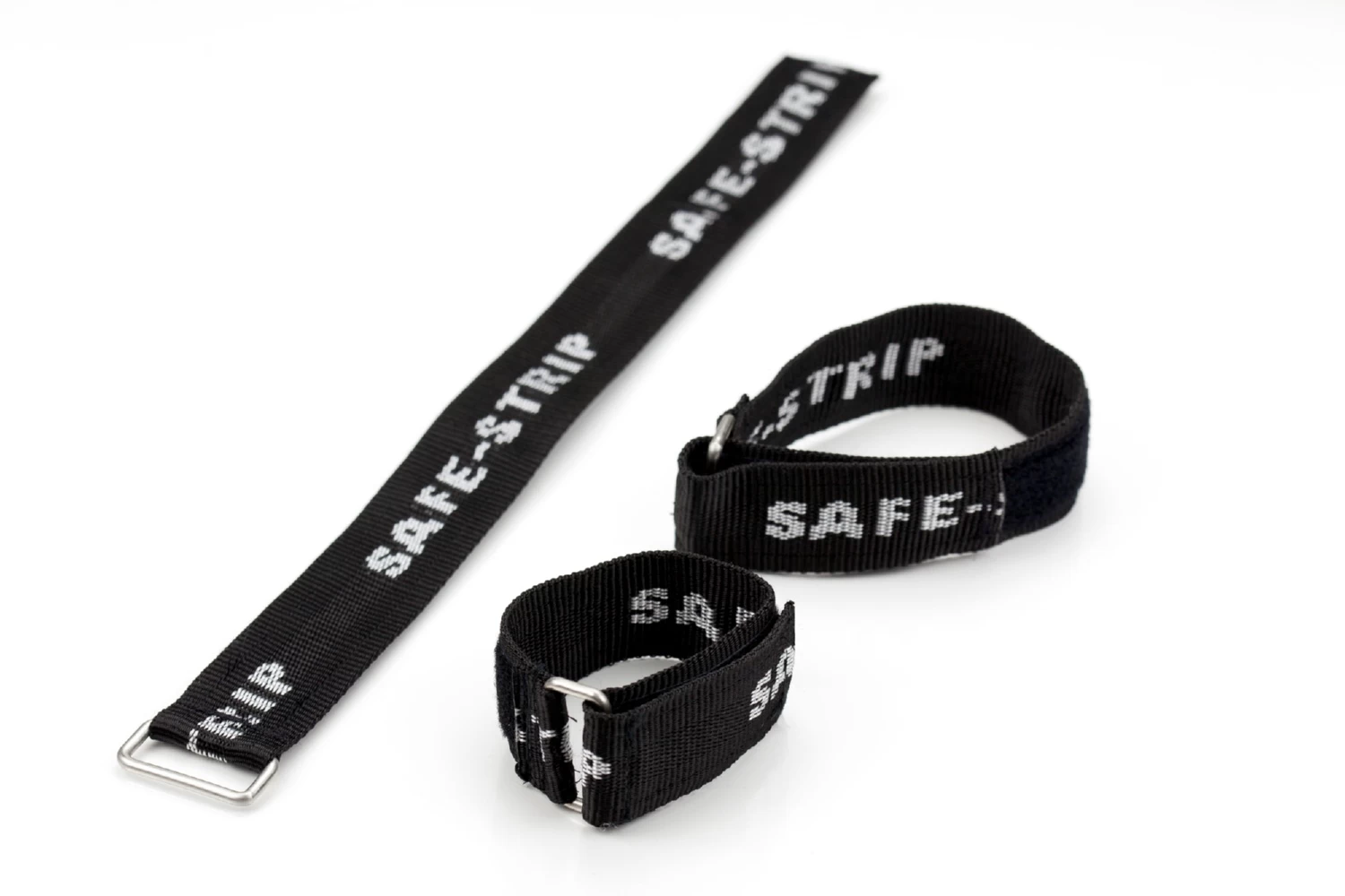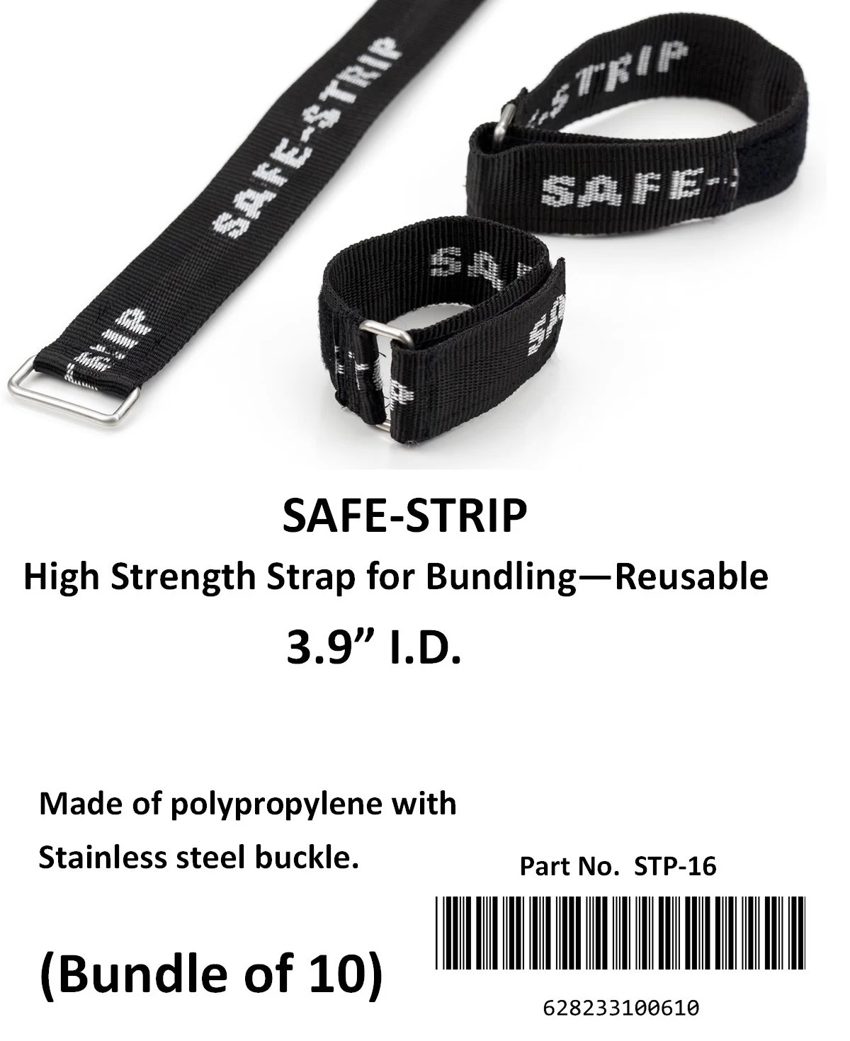 Safe-strips bundle hydraulic hoses together and can be used again and again. They are made of polypropylene and have Velcro brand fasteners. The buckle is stainless steel.
