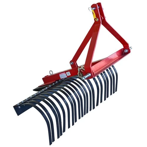 Our 4-foot three-point lawn rake is a versatile tool that can handle many of your farming jobs. You can use this landscape rake to perform grading, soil preparation, and lawn preparation; you can also use it to clear rock, spread topsoil, level soil, break up clumps of sod, and more.