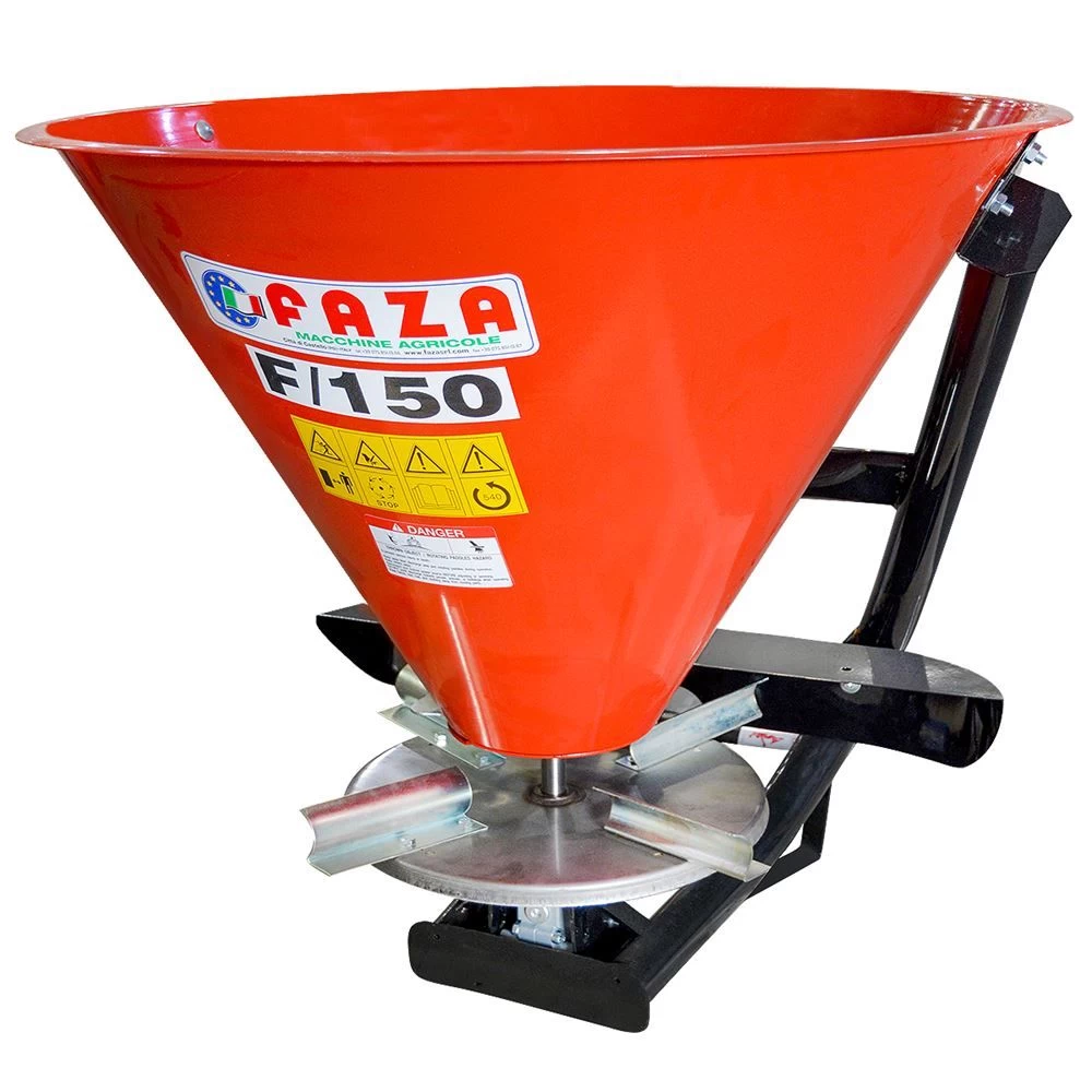 The Faza fertilizer spreader, Model F150, is designed and constructed to allow the distribution of granular fertilizer and seeds in the field. The 3-point spreader has a manual adjusting gearbox to allow a spreading width from 6-1/2 to 39 feet (2-12m). Constructed of steel and baked with epoxy varnish, this broadcast spreader is resistant to damage and corrosion. PTO shaft is included. Agitator Option Not available for this model.