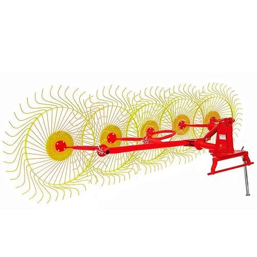 Whether you are forming crops into windrows or cutting hay to be collected later, use this 5 wheel hay rake. This hay rake attaches to the right side and has a 3-point hitch. This durable agricultural equipment measures 17 ft. in length.