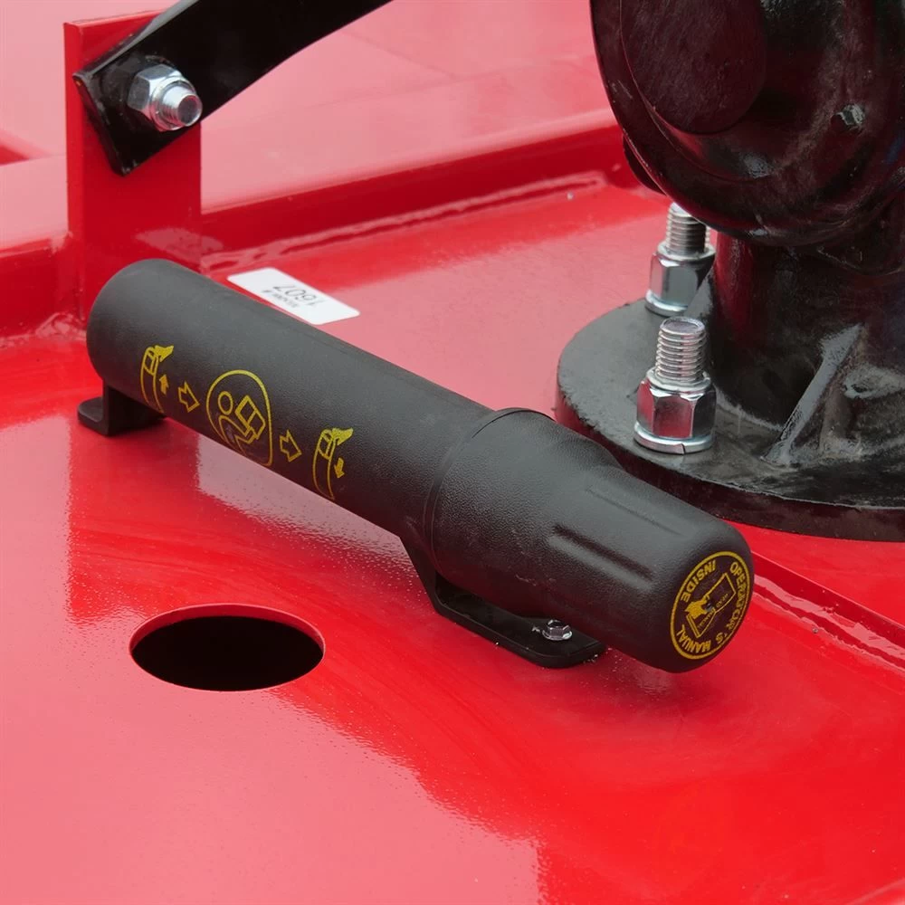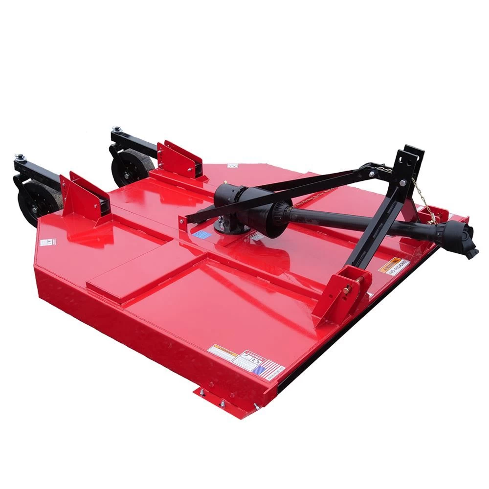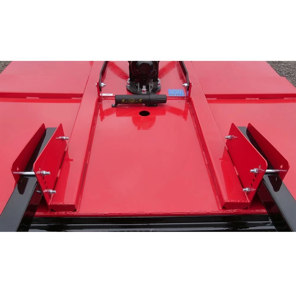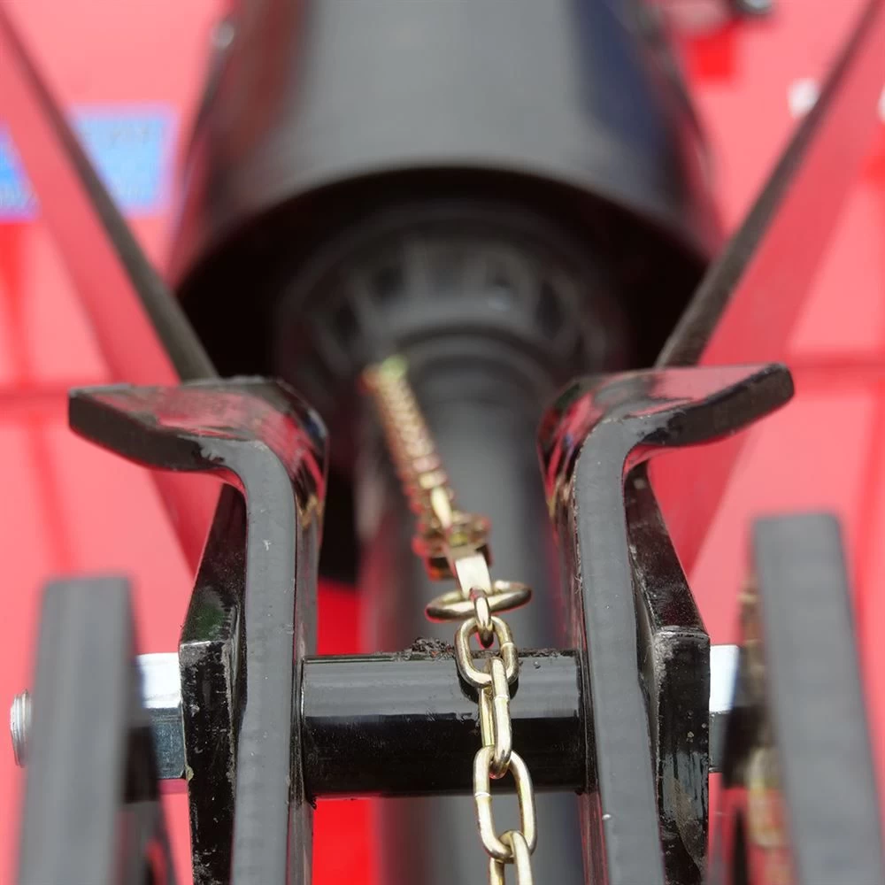 This mower is designed to work with 90 horsepower tractors and uses a single spindle with two free-swinging blades that reduce the shock of impact when a stationary object is contracted. The mower comes with a shear bolt through the input shaft the slip clutch that protects the gearbox and driveline from damage. CHAINS NOT INCLUDED