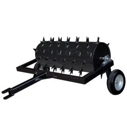 This tow behind spike aerator, from Maxim, has a tank capable of holding up to 32 gallons of water for additional weight. Weighing just over 126 lbs., with the addition of water, this aerator can weigh up to a little over 326 lbs. The aerator has 2-ply 410 x 350 x 4 wheels (for transport only.)