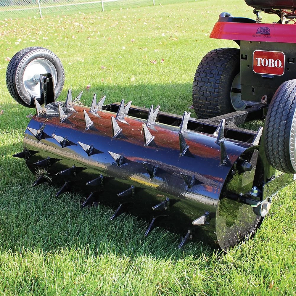 Transport with spikes in up position. When your ready to begin aerating simply fold the hitch over the top of the unit and hook to mower. This spike aerator is a lawn roller that helps you create a beautiful landscape. This spike aerator penetrates the ground, to loosen soil, increase water filtration and oxygen to the grass roots.