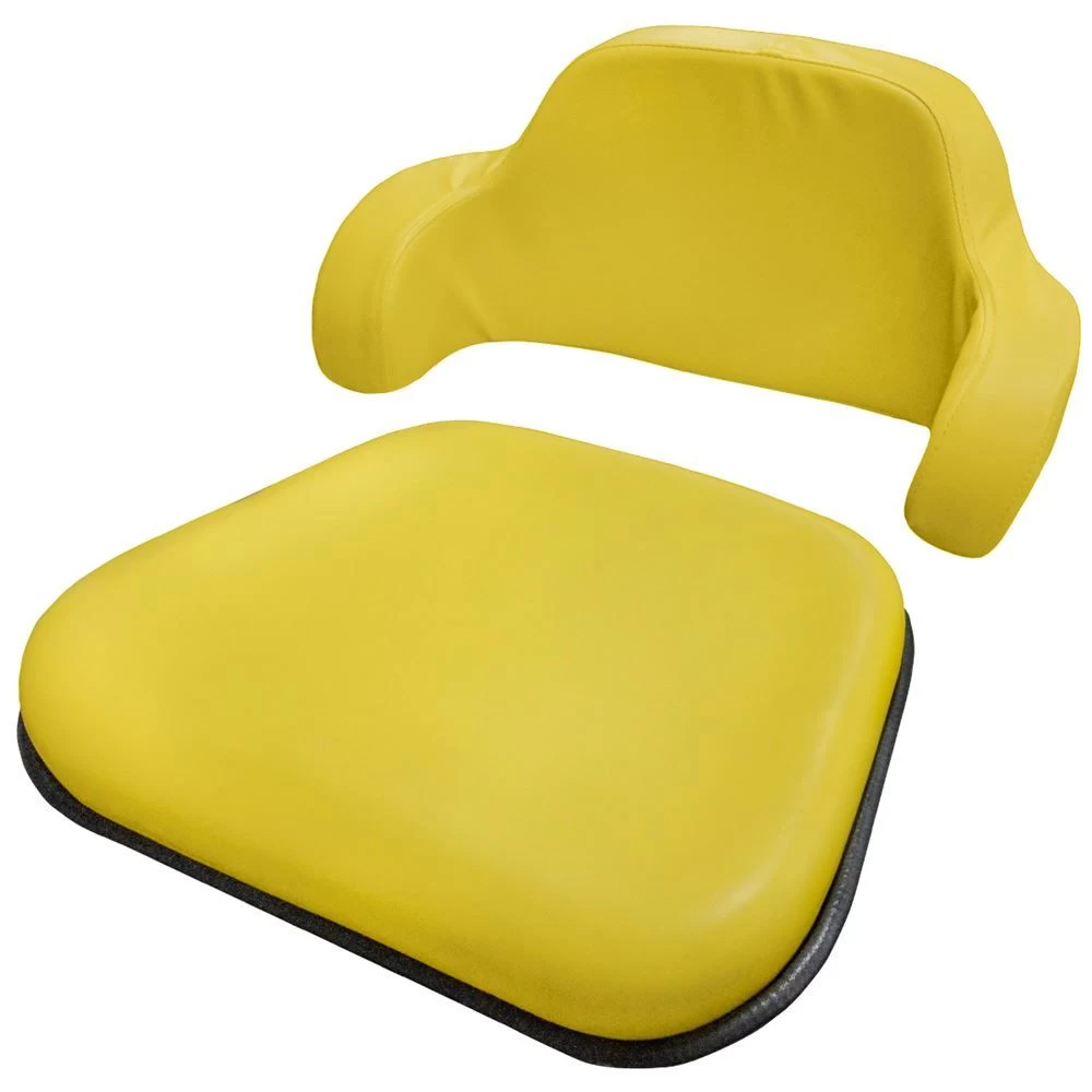 Keep work a comfortable experience by replacing worn tractor seats. This yellow, two piece cushion set is made to last and replaces the seat and backrest of various John Deere models. It is made with built-in arm rests, supported with a steel back frame construction. The cushions are constructed with high density foam and are covered by a heavy duty vinyl to last.