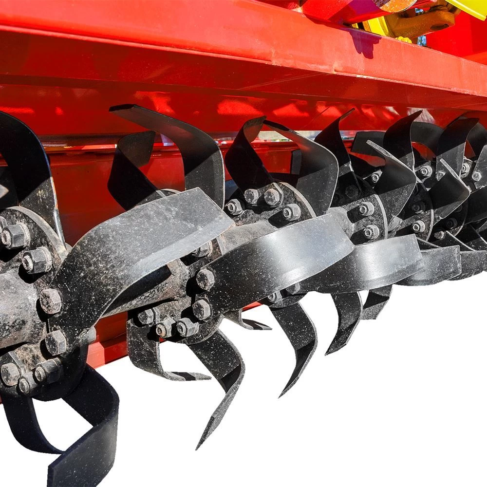 Cultivate large plots of land with this 3-point rotary tiller. With a working width of 7 feet, this tiller is operable at a horsepower range of 45 to 60, with a maximum RPM of 540. It connects to category 1 hitches, and transfers power through a PTO shaft measuring 22 inches in length. Other features include a gearbox with slip clutch protection, and a rotor drive that is controlled by a rotor drive system. This rotary tiller has 66 rotating tines across 11 flanges that work to cut through, dig, and turn, the soil during the field preparation process. All nuts and bolts to secure the tines are included.