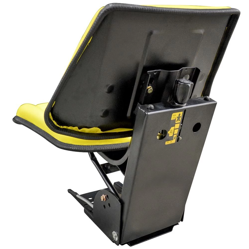 This is a universal tractor seat with suspension and features vinyl covered molded cushions. This tractor seat has an adjustable weight suspension and adjustable base angle slides.